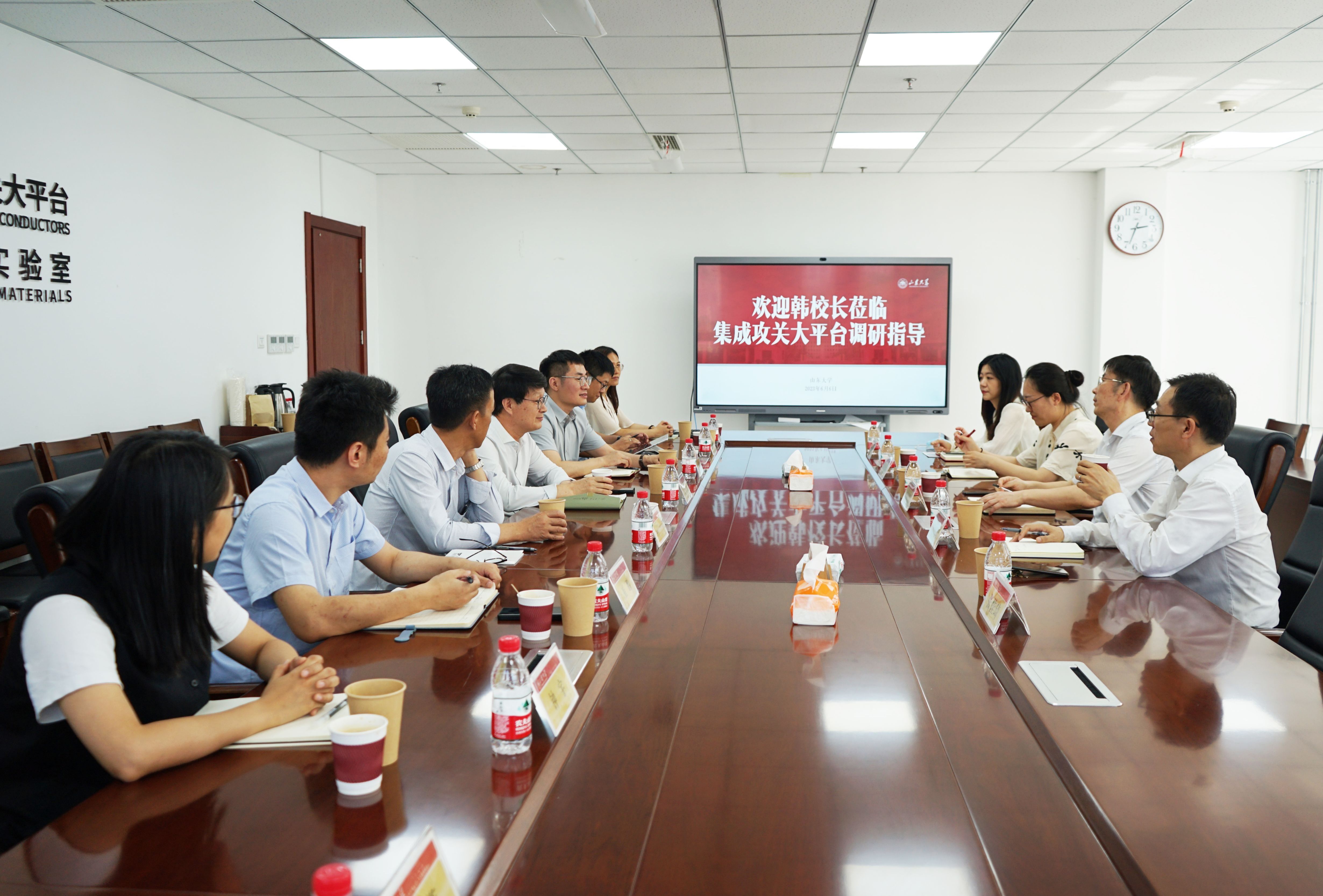 6月6日下午,90ko即时比分 前副校长韩圣浩教授,国际事务部部长孙凤收,副部长姜宏敏、张佳琦、高歌等领导来访新一代半导体材料集成攻关大足球比分即时比分 参观调研。集成攻关大足球比分即时比分 特聘教授韩吉胜、特聘...