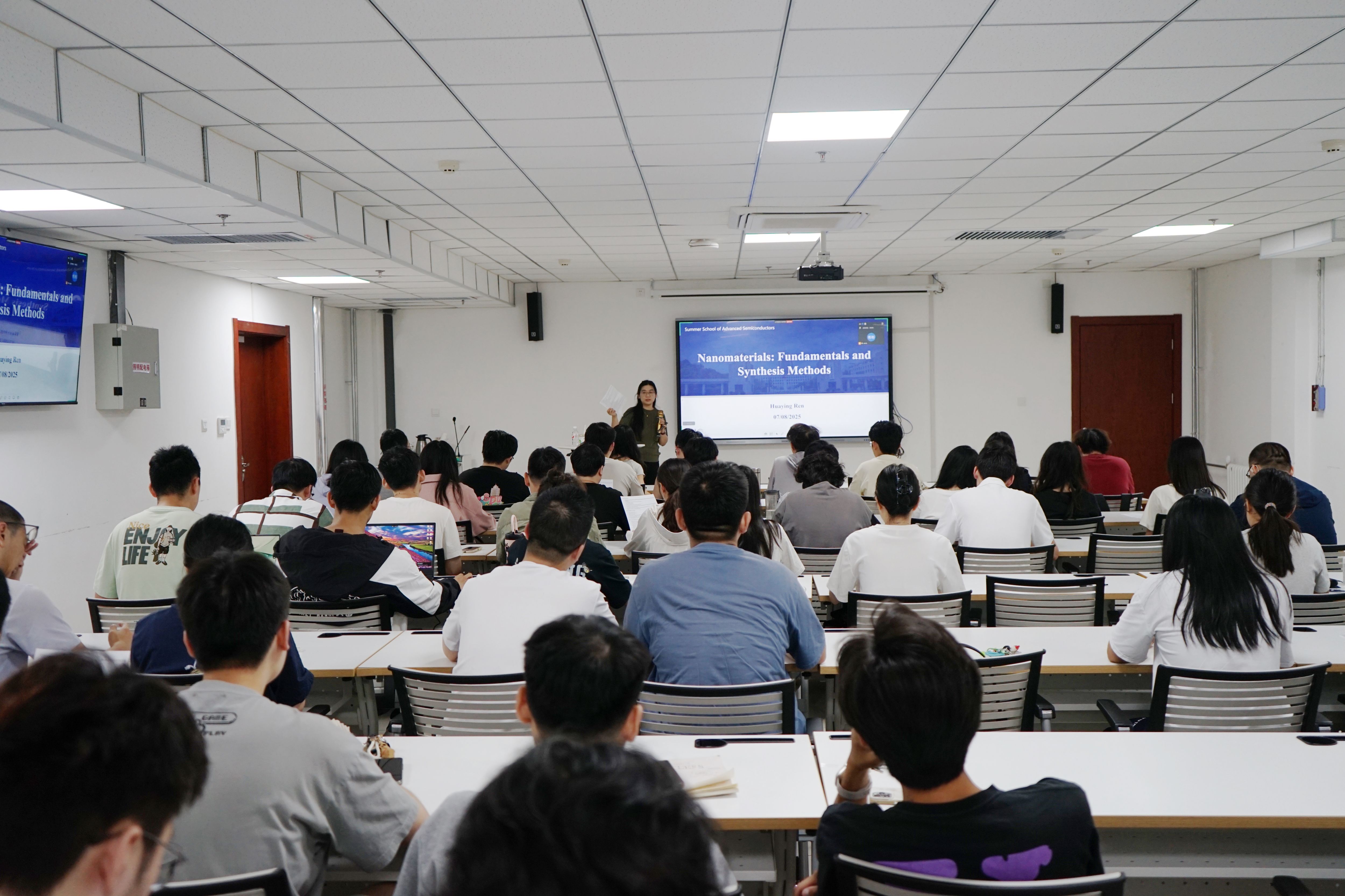 7月8日,暑期学校课程持续推进。上午,国家海外优秀青年科学基金获得者任华英教授带来“Nanomaterials: Fundamentals and Synthesis Methods”讲座,系统介绍了纳米材料的结构特性与量子限域效应,详细讲解了液相合成(如0D纳米晶/量子点的制备)和气相合成(如ALD、MBE、CVD等原子级精准外延技术),并介绍了石墨烯、h-BN等二维原子晶体材料的基本结构与新奇物性。下午,梁奇博士再次登台,以“CVD Nanocrystalline Diamond: From Laboratory Innovation to Commercial Success”为题,分享了纳米晶金刚石从实验室研发到商业化应用的全流程探索,为师生们展现了科研成果转化的实践路径。