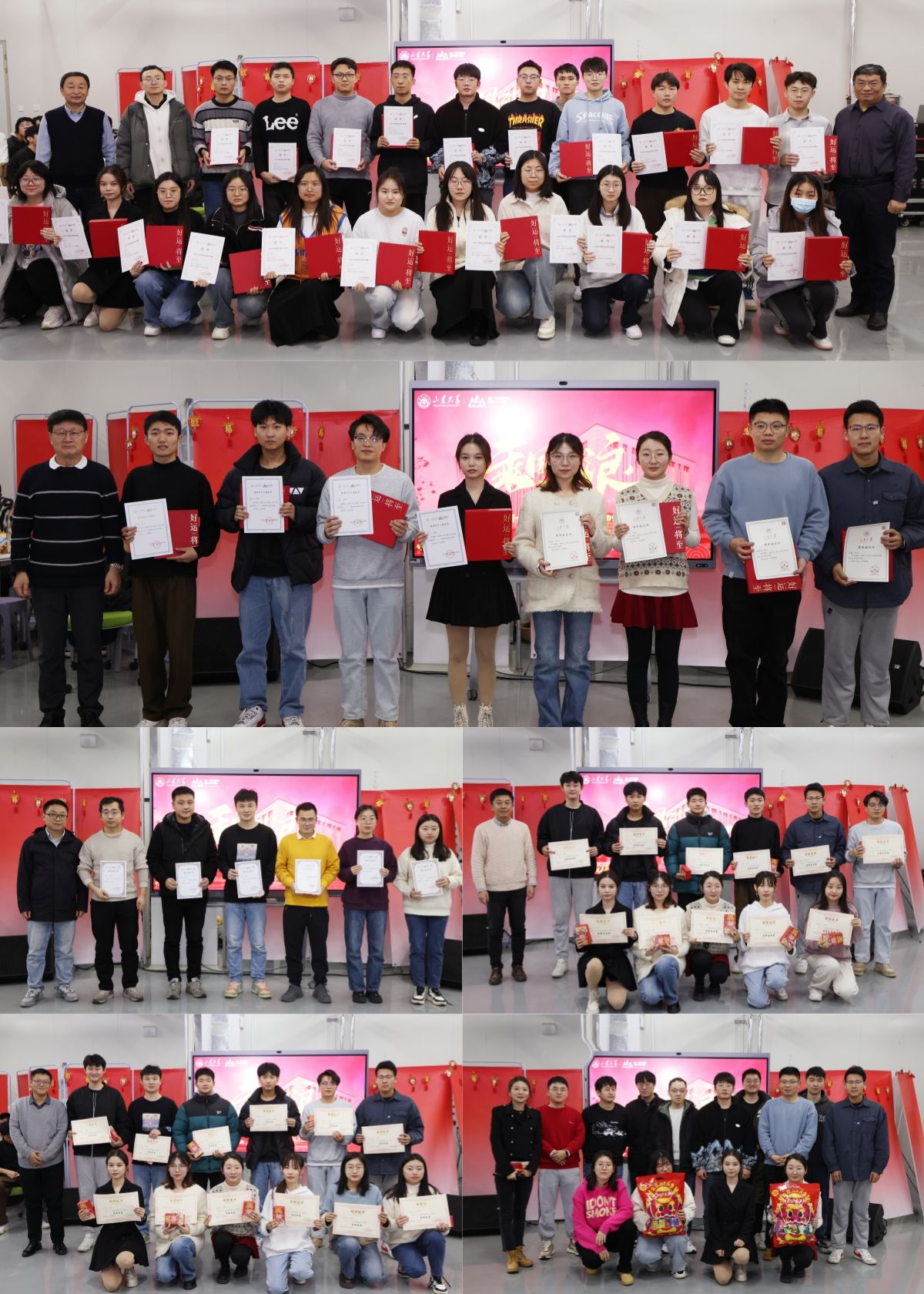 随后进行的是“优秀学生”表彰环节,晚会依次颁发了“优秀推免生”、“优秀学生干部”、“铂锐追光奖学金”、“优秀志愿者”、“文体之星”和“优秀办公室”奖项。表彰结束后,各位领导老师和同学们共同合拍全家福,共贺新年。