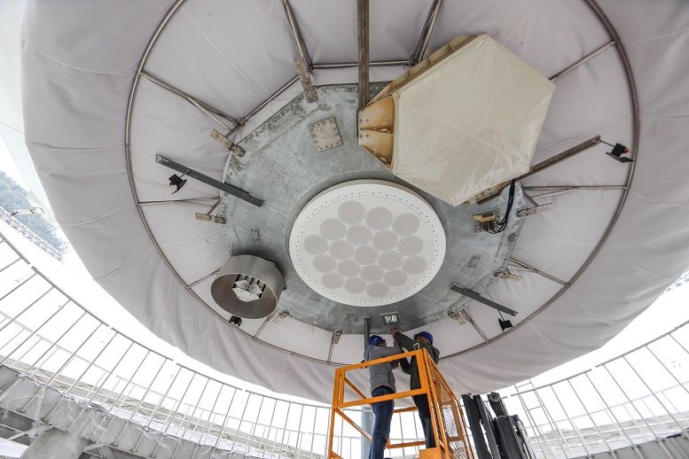 图:2021年12 月17日,工作人员对“中国天眼”的馈源舱进行维护保养 欧东衢 / 摄