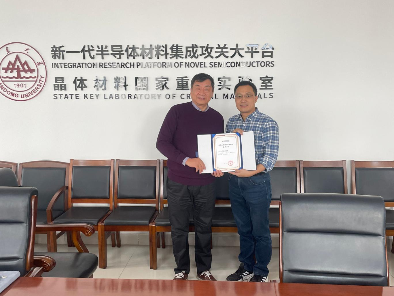 报告结束后,参会师生围绕高熵玻璃的发光机制以及高功率全固态激光技术展开积极讨论。交流过后,何京良教授对林学春老师表示感谢并颁发聘书。