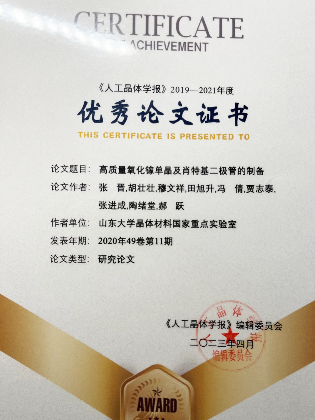 图:氧化镓攻关组成员论文获《人工晶体学报》年度优秀论文