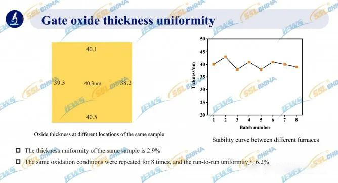 报告最后,徐明升教授讲解了高温氧化研究方面近界面陷阱的密度、界面陷阱电荷、TEM横截面图、栅极氧化物厚度均匀性;沟槽MOS晶体管研究方面,涉及SEM俯视图、欧姆接触、器件性能等内容。详细分析4H-SiC在1250°C下的氧化,厚度~45nm,SiO2和SiC之间的NITs: ~ 1.68×1010 cm-2,击穿电场为9.7MV/cm,势垒高度为2.59eV等研究内容。