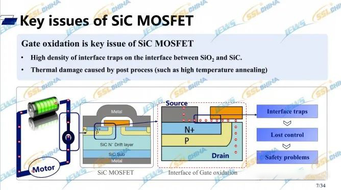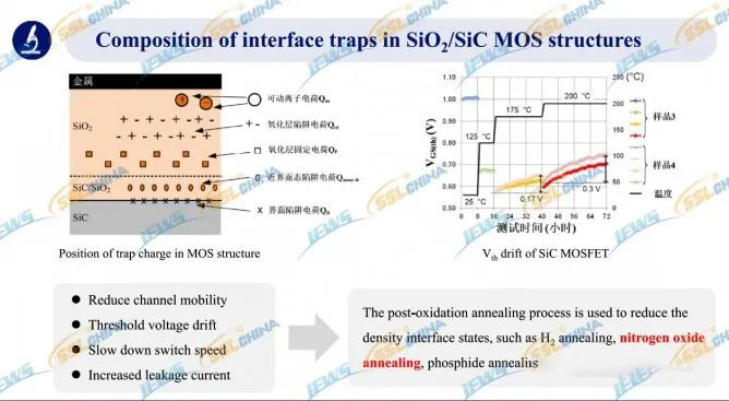 徐明升教授做详细实验数据分析,他表示SiC沟槽MOSFET具有优异的耐高压、大电流特性,器件开关损耗比Si基IGBT低约77%。SiC MOSFET器件的阈值电压漂移影响了其广泛的应用,其根本原因是栅极氧可靠性差,栅极氧化是影响SiC MOSFET器件广泛应用的关键问题。