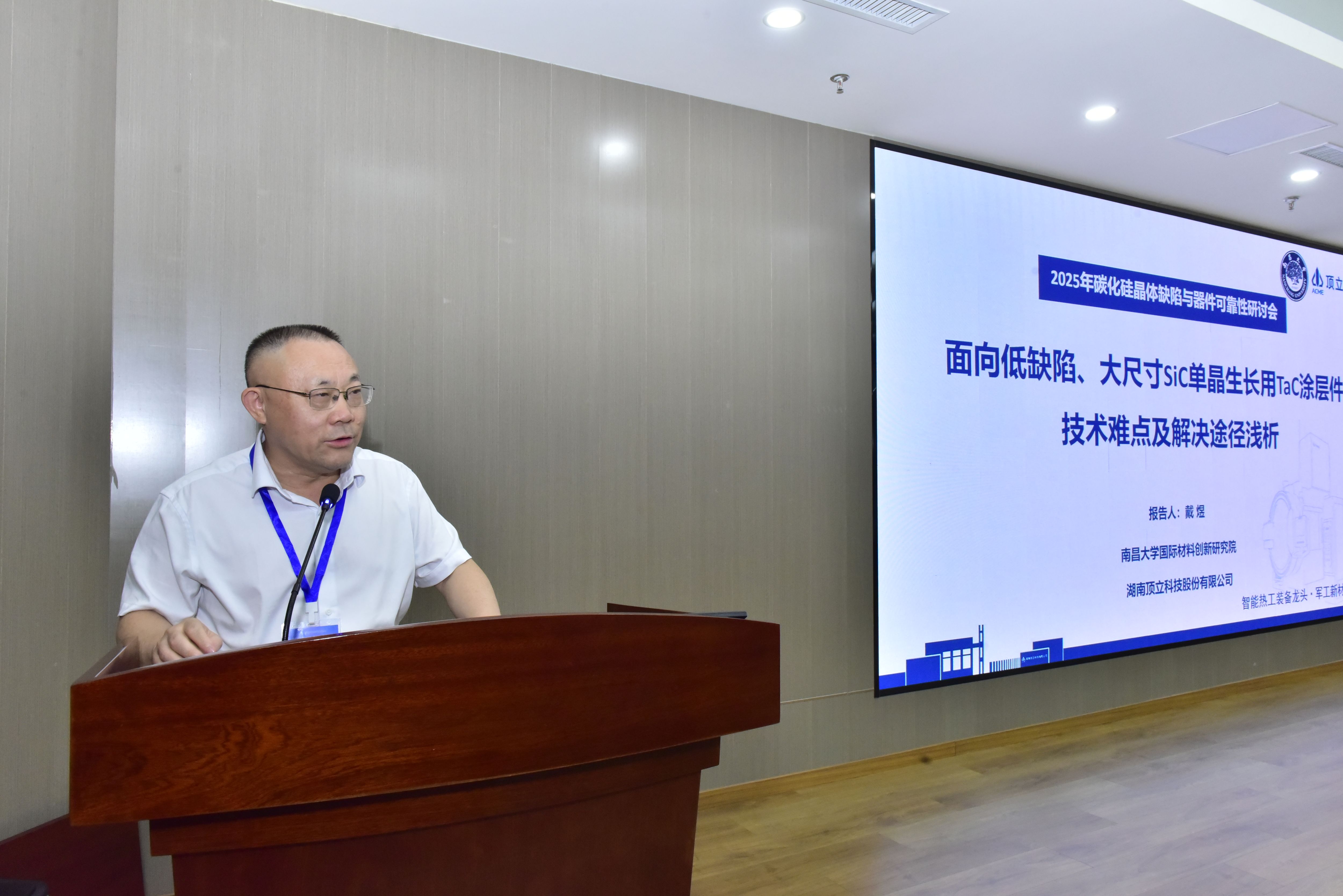 在陈秀芳教授主持的专题报告阶段,浙江大学余学功教授分享“直拉硅单晶的生长及相关缺陷的调控”,介绍了直拉硅单晶生长过程中缺陷的调控方法;天津工业大学梅云辉教授探讨“功率半导体封装技术与发展趋势”,分析了功率半导体封装领域的技术现状与未来趋势;湖南顶立科技股份有限公司戴煜教授浅析“面向低缺陷、大尺寸SiC单晶生长用TaC涂层件技术难点及解决途径”,提出了该类涂层件技术难题的应对思路。