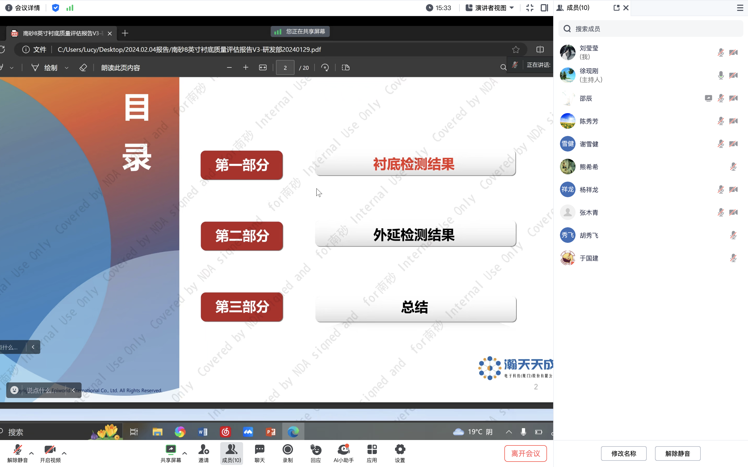 先锋攻关团队成员邵辰博士作会议报告,她从团队近期衬底测试情况、广州南砂衬底使用情况、南砂8英寸衬底质量评估报告、外延情况应对等方面进行详细汇报与分析。攻关团队谢雪健、杨祥龙、胡秀飞、张木青、熊希希、于建国等成员参会,并就汇报内容进行深入探讨交流。