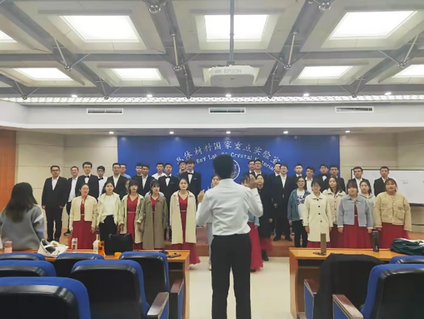 参赛的同学们在忙碌的科研学习生活中抽出时间来进行排练,一次次相聚在晶体材料研究院二楼的报告厅。临近比赛,同学们每次排练都站立将近两个小时,赵指导和肖指挥总是通过各种方法来调动大家的情绪,以表演小节目等方式来缓解大家焦虑和紧张的情绪,同学们的坚持与进步离不开他们的陪伴和鼓励。