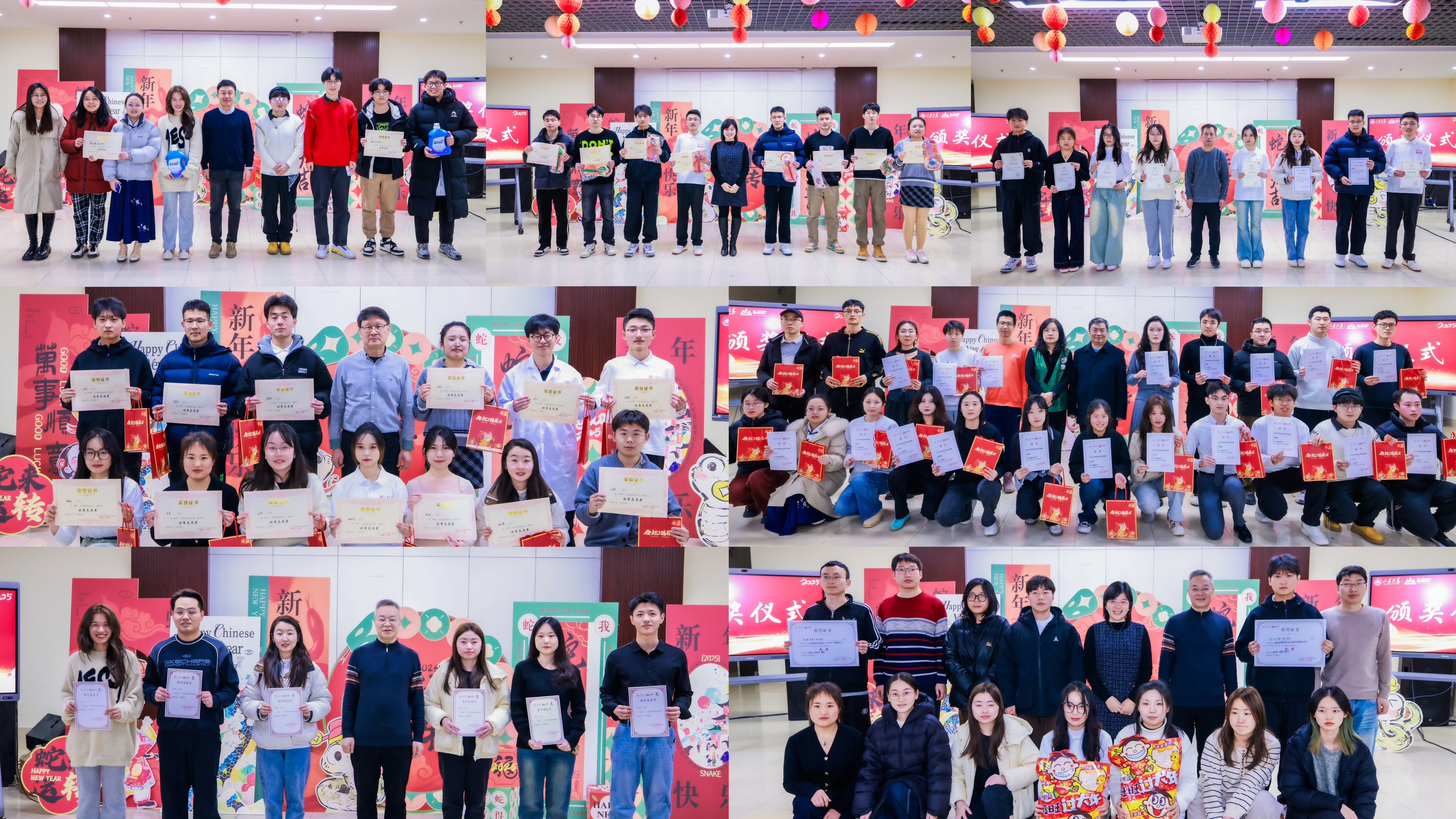 随后进行“优秀学生”表彰环节,晚会依次颁发了“优秀推免生”“优秀志愿者”“文体之星”“优秀学生干部”“优秀宿舍”“铂锐追光奖学金”和“建行杯”山东省大学生创新大赛(2024)”奖项。表彰结束后,师生同框,快门轻响,现场各位老师同学合拍全家福,共贺新年。