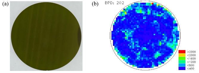 图1:8英寸导电型4H-SiC单晶衬底以及对应的BPD密度分布