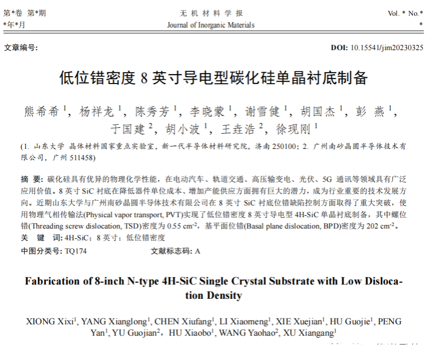 8月,集成攻关大足球比分即时比分 碳化硅团队合作以“低位错密度8英寸导电型碳化硅单晶衬底制备(Fabrication of 8-inch N-type 4H-SiC Single Crystal Substrate with Low Dislocation Density)”为题在《无机材料学报》发表(DOI: 10.15541/jim20230325),第一作者熊希希,通信作者陈秀芳、杨祥龙。
